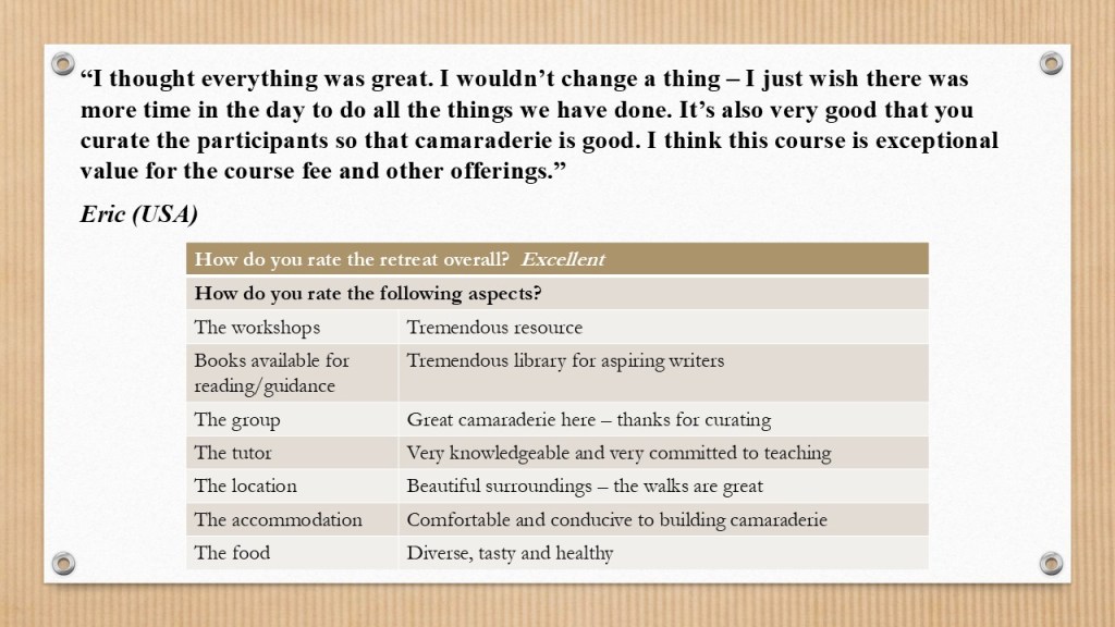 The workshops built on the group’s shared knowledge base. I provided recaps of what we had covered during their previous retreats: on Day 1, Story Structure and Plot Development; on Day 2, Story Openings; on Day 3, Characterisation… We quickly reviewed these notes together, then moved on to exercises that drilled down into the relevant topic while introducing something new and unleashing creativity. For example, our session on Characterisation was paired with exploring the uses and effects of music (in both fiction and life writing); another exercise delved into the narrative possibilities of photographs, to experiment with Point of View and ‘Psychic Distance’; and so on. You can read attendees’ feedback in their own words. The response has been so enthusiastic that I plan to repeat this retreat next year. I’ll be contacting the community of former participants soon to find out which dates work best.