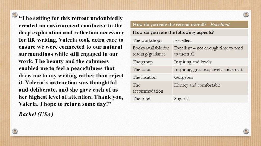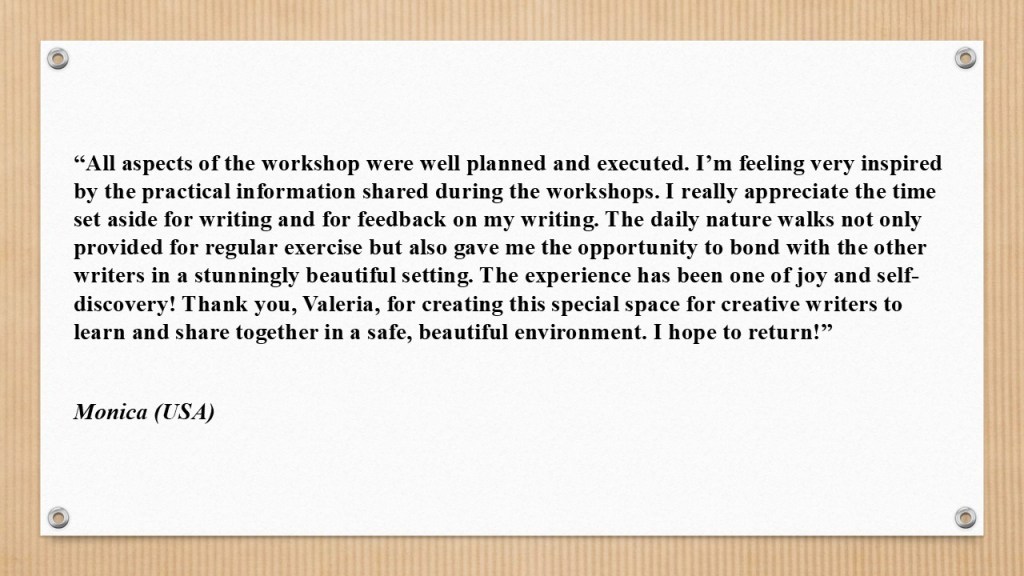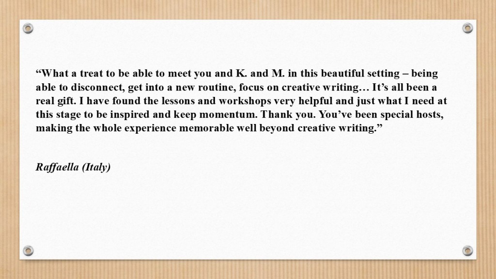 The days involve a mix of lectures, workshop exercises, feedback, and individual writing time. A maximum of three participants means your work receives a truly exceptional degree of attention – from me and from your fellow attendees. And then, of course, there’s a warm social side to it: meals and easy walks offer more opportunities for getting to know others who share your passion for writing, and for making friends. Participants often stay in touch with one another after the retreat, exchanging feedback on their writing projects on a regular basis. I’ll leave the word to them, through their testimonials!