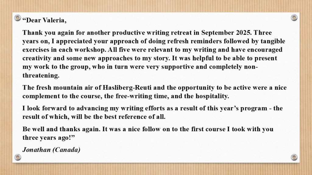 In the meantime, the next tutored retreat (open to participants at all levels of experience) will run from 1 to 7 March 2026 – an inspiring week designed to nurture your writing, spark new ideas, and connect you with a community of fellow writers. If you’d like to be part of it, you can find details here: https://valeriavescina.com/teaching/writing-retreats/ In that period, Hasliberg-Reuti is often covered in snow, making the landscape magical in yet another way.