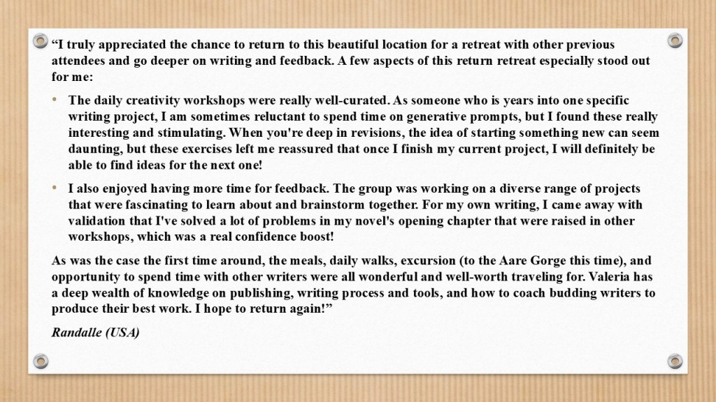 If you’d like to learn more about these writing retreats in the Swiss Alps, and to book, click here.