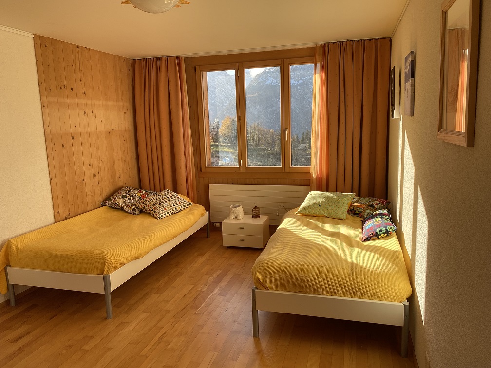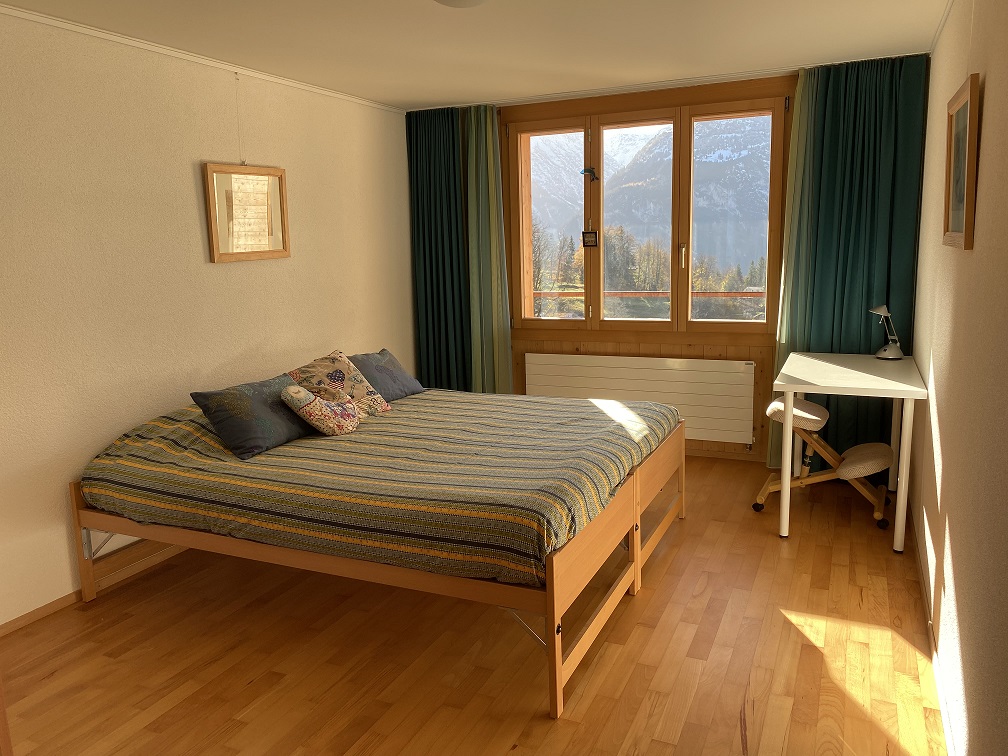 You’ll be staying at a luxury four-bedroom apartment in a modern chalet in Reuti, a postcard-pretty village at approx. 1070 metres above sea-level. It’s an easy walk (c. 200 meters) from the flat to the local cafés, restaurants, shop and public transport. There you can also board aerial cablecars to explore the little town of Meiringen in the valley or the high-alp meadows of Mägisalp (1710 meters above sea-level).