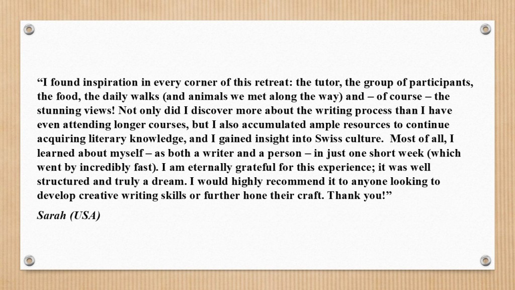 … And if you live in Switzerland, see here for future workshops. For example, Valeria has run the Rosenburg Writers series of whole-day masterclasses on writing craft for and at the amazing Literaturhaus Zentralschweiz in Stans (NW), just 15 minutes by train from Lucerne. She has also taught for the Geneva Writers’ Group in Bellevue (GE) and at its bi-annual international Writers’ Conference.