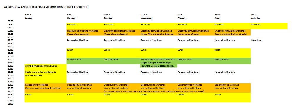 Workshop- and feedback-based retreats: this format involves more personal time to write. If you’ve studied the craft and practised creative writing for a while and are now yearning chiefly for focused writing time and feedback in an inspiring, supportive environment, this is the retreat for you. A sample schedule is shown below. The day begins with a 60- to 90-minute workshop to stimulate your creativity; this includes a brief review (with handouts) of the element of writing (e.g. characterisation) to which the exercise relates. Feedback sessions take place in the afternoon. Usually open to a maximum of 3 participants (though up to 6 is possible, with sufficient notice).