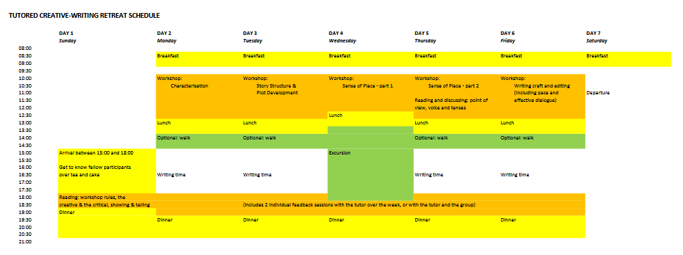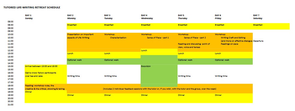 Tutored retreats: daily lectures and workshops on key elements of the writing craft (characterisation, story structure and plot development, point of view, sense of place, dialogue, revising and editing techniques), as well as feedback sessions. Typical schedules for the 6 days are shown below (one for fiction writers, the other for life writers). Open to a maximum of 3 participants. This format caters for writers at all levels of experience, from beginners to advanced.